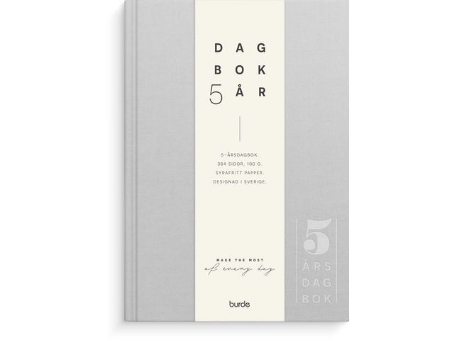 Dagbok som sträcker sig över fem år, årsneutral. Cremefärgat, syrafritt och åldersbeständigt papper. Följ vad som hände samma dag olika år. Plats för vädernoteringar.