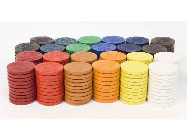 Svart, mörkröd, gul, mörkblå, röd, brun, ljusgrön, vit, ljusblå, mörkgrön, orange och lila.