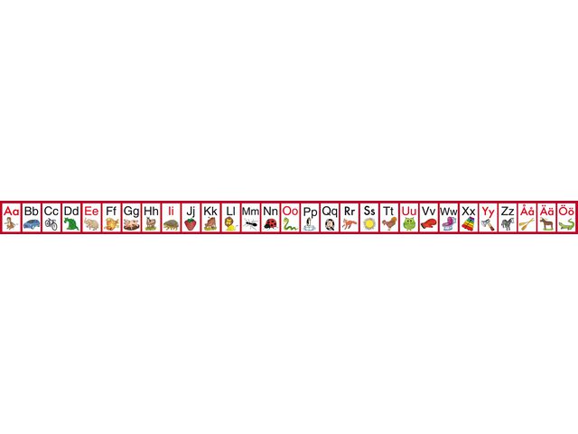 Alfabetsremsan är ett praktiskt hjälpmedel till eleverna att ha på skolbänken som stöd när de ska lära sig alfabetet. Även vokaler och konsonanter är markerade med olika färger på bokstäverna. Varje elev kan få sin egen alfabetsremsa! Format 28 x 480 mm. Ingående råvara FSC-märkt.