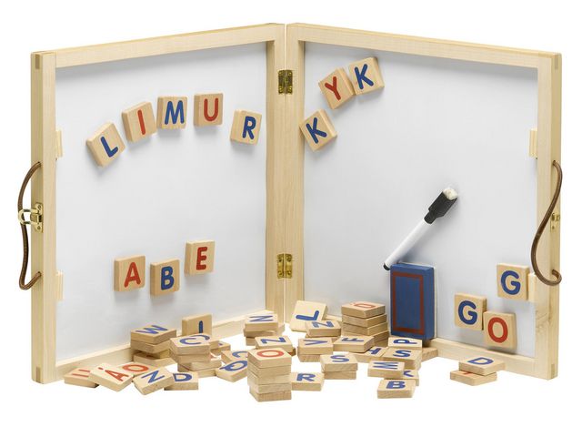 Innehåller tavla, whiteboard, torktrasa och 67 stycken bokstäver (versaler) med magneter.