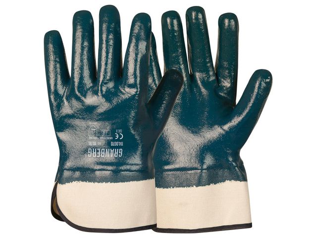 Handskarna är heldoppade med slitstark nitrilöverdrag och gummerad manschett. Speciellt lämpliga för grovt arbete i torra arbetsmiljöer där det finns stor risk för nötningsskador.