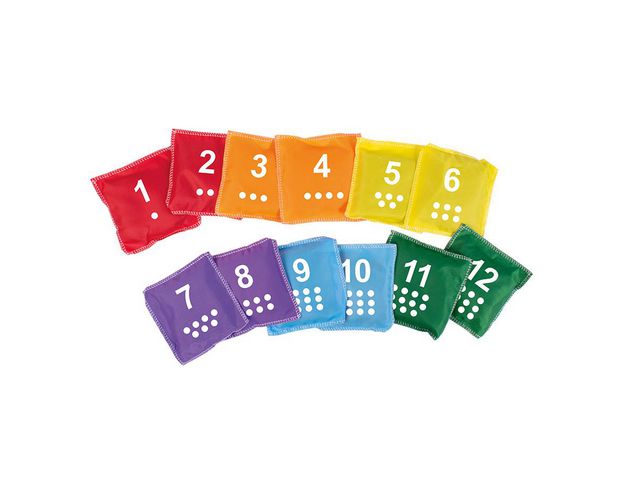 Färgglada ärtpåsar med tryckta siffror och prickar 1-12.