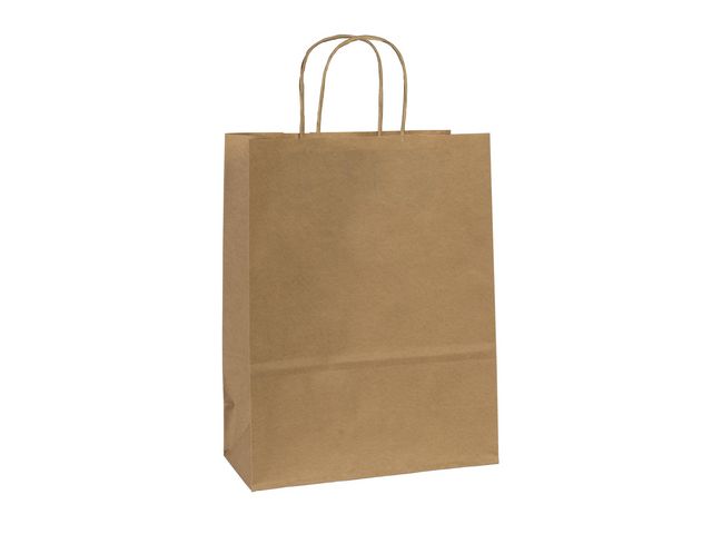 Högkvalitativ papperskasse med handtag av tvinnat papper och förstärkt botten.
