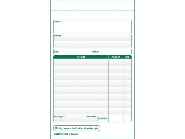 Svensktillverkade kassanotor i A6-format. Tillverkade i ISO-certifierat tryckeri i skånska Göingebygden. Råvaror köps in från pappersbruk i Sölvesborg, i närområde till fabriken. Numrerade kassanotor (1–50) med en (1) kopia. Klammerhäftad stam i överkant. 2 x 50 blad. Paragonblock.