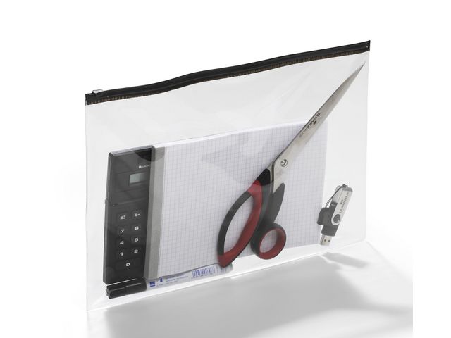 Den blixtlåsförsedda fickan från DURABLE kan användas för att förvara kosmetika, brevpapper eller viktiga kvitton. Du får enkelt plats med minst fem artiklar. Detta säkerställer att du snabbt har tillgång till allt du behöver. Dessutom kan du se innehållet i den blixtlåsförsedda påsen utan att behöva ta ut artiklarna eftersom påsen är genomskinlig.