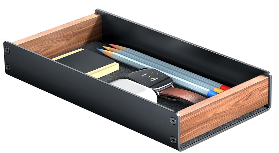 Elegant förvaringsbricka i valnöt och svart aluminium – ordning med stil.