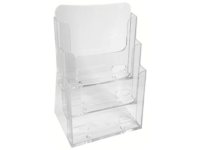 Ett broschyrställ med tre fack för A4. Stället är tillverkat av klar polystyren. Varje fack har ett djup på 28 mm.