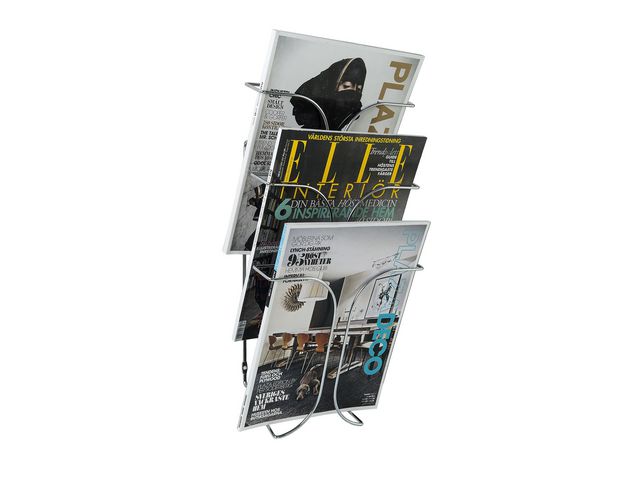 Ett kromat broschyrställ med 3-fack A4 för montering på vägg.