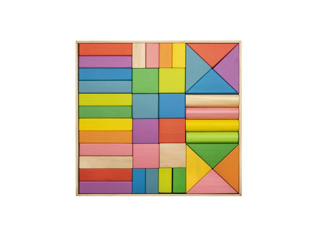 De iögonfallande färgerna i kombination med olika former så som rutor, rektanglar och stavar för att nämna några, gör dessa block till ett mångsidigt hjälpmedel i kreativ lek.
