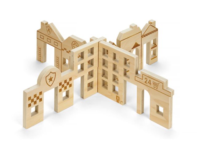 Stadsinspirerade avdelare i björkplywood, som enkelt passar ihop för att skapa en fantasifull lekplats i fyra riktningar.