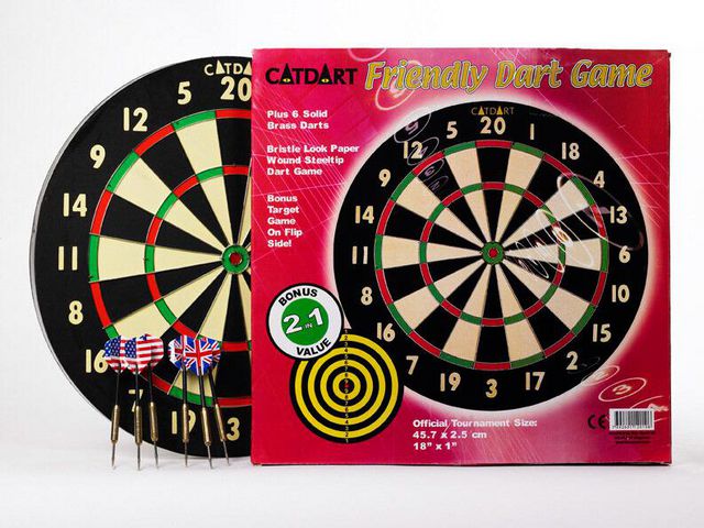 Klassisk darttavla med 6 mässingspilar fördelat på 2 set.