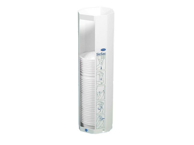 Dispenser för SicSac kräkpåsar. Består av vitlackerad plåt för väggmontering. Liten och platssparande. Monteras på väggen och gör påsarna lätttillgängliga. SicSac Dispenser är godkänd av Byggvarubedömningen.
