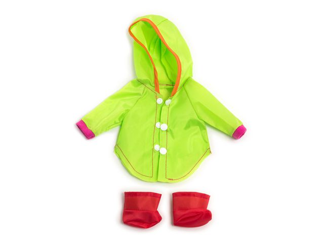 Setet innehåller regnklappa och stövlar till docka 32cm. Att klä av och på, använda spännen och olika delar hjälper till att främja barns finmotorik.