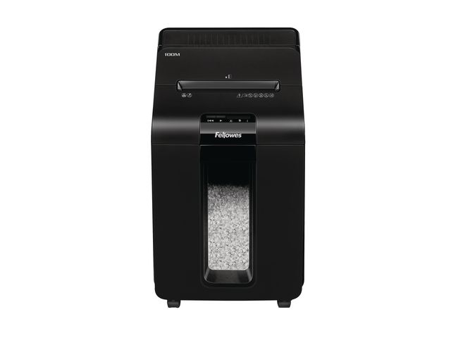 Fellowes AutoMax 100M kan snabbt matas med upp till 100 ark i automatiska mataren eller 10 ark manuellt. Den skär Mini-cut bitar på 4 x 10mm som är 4 gånger säkrare än vanlig cross-cut. Den har en papperskorg som rymmer 23 liter. Den är snabb och effektiv och låg ljudnivå. Försätts i viloläge efter en tids inaktivitet
