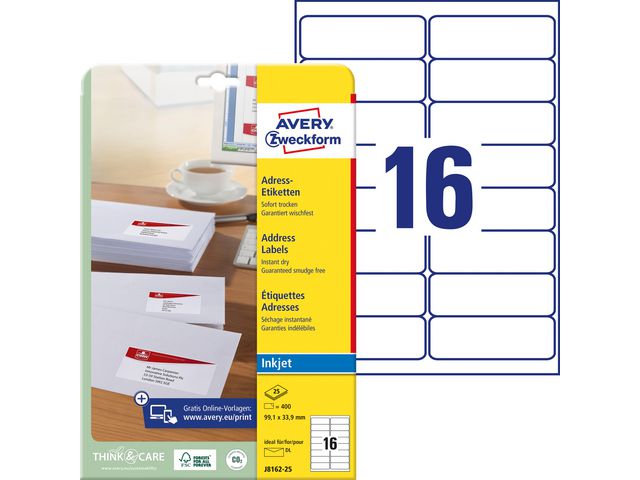 Snabbtorkande etiketter för bläckstråleskrivare. Den specialbelagda QuickDRY™-ytan gör att bläcket omedelbart absorberas i papperet så att du kan ta arket direkt från skrivaren och använda etiketterna utan att riskera kladd från bläcket.