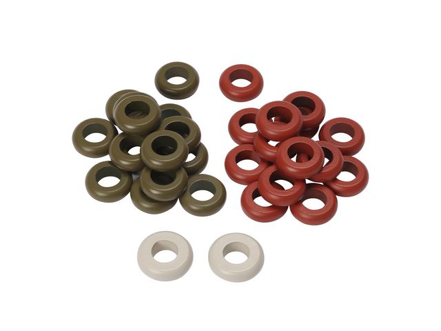 Du kan ersätta förlorade spelpjäser till Micki Couronne med en extra förpackning med de här ringarna i rött, gult och grönt. Varje ring är utformad i spelets standardstorlek.