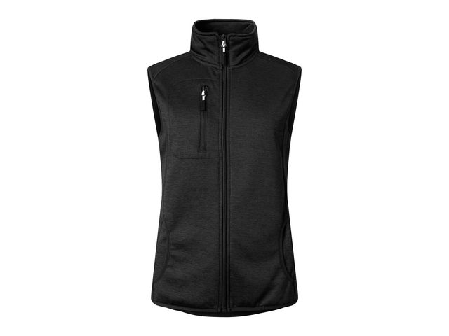 Fleeceväst för dam i melerad singel jersey bondad med fleece. Bröstficka och två sidfickor utan blixtlås.
