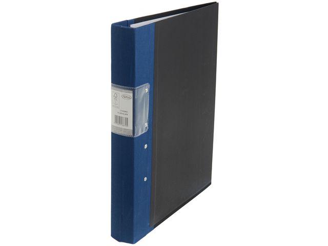FSC-märkt svart träryggspärm med blå tygklädd rygg. MDF-skiva för en mer stabil och stadig pärm.