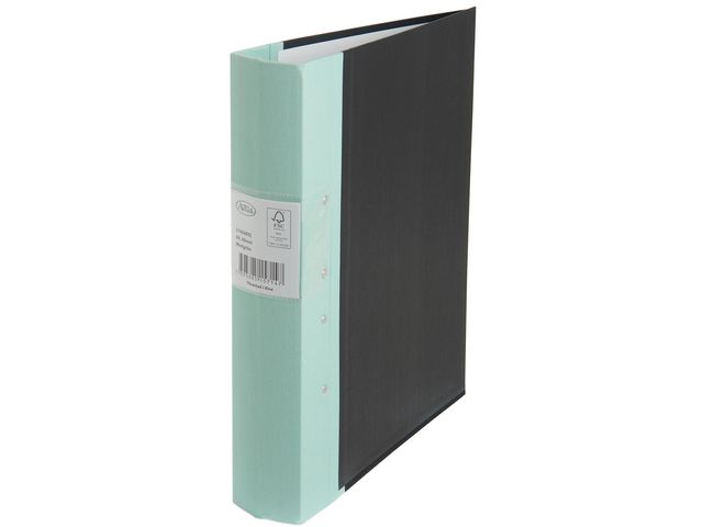 FSC-märkt svart träryggspärm med mintgrön tygklädd rygg.
