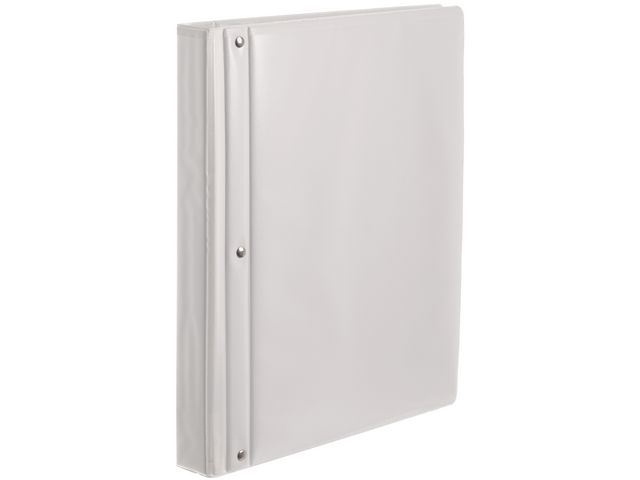 Presentationspärm med gaffelmekanism samt plastficka på framsida och rygg för instickning av t,ex, en omslagsbild eller ark med beskrivande text.