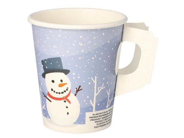 Pappersmuggar tillverkade av förnyelsebara råvaror med design av snögubbe. Kan användas upp till 90 grader.