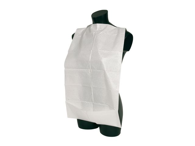 Polyeten och tissue, oblekt. Förstärkt knytband, färdigvikt. Med laminerad baksida. Produkten är CE-märkt.