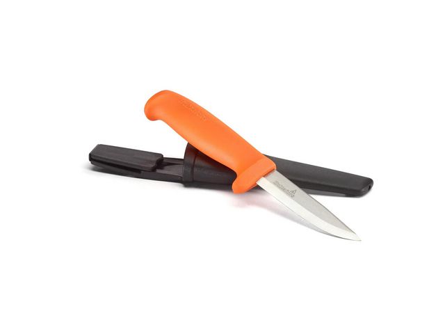 Knivbladet är tillverkat av 2,5 mm kolstål som härdats till 58–60 HRC.