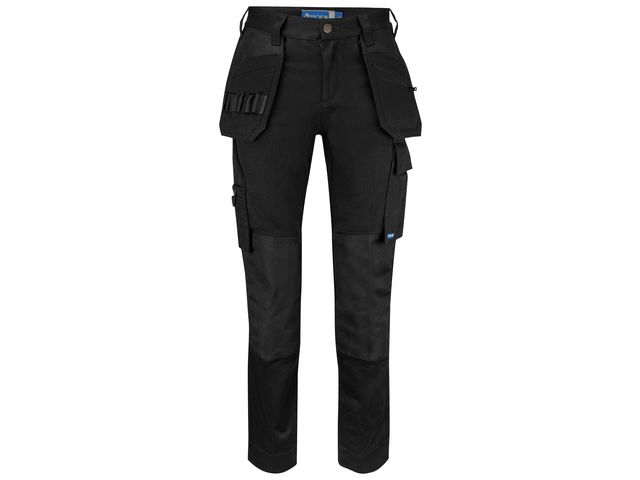 Hantverksbyxa med undanstoppningsbara hängfickor, den ena med dragkedja. Bakfickor med lock och kardborrestängning. Benficka med extra fack och lock med kardborrestängning. Tumstocksficka med knivhållare. Förstärkning i hängfickor, tumstocksfickan och på knäskyddsfickor. Förböjda knän med knäskyddsfickor som går att reglera i två höjder, öppning inifrån. Kan förlängas med 5 cm genom ett utvik i benslutet. Reflexdetalj/piping bak på vaden.