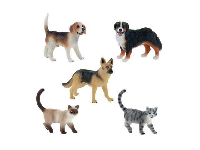 Lek med några av våra käraste husdjur i detta lekfulla set innehållandes fem stycken figurer, tre hundar och två katter. Alla är handmålade och helt fria från PVC. Notera att innehållet kan variera.