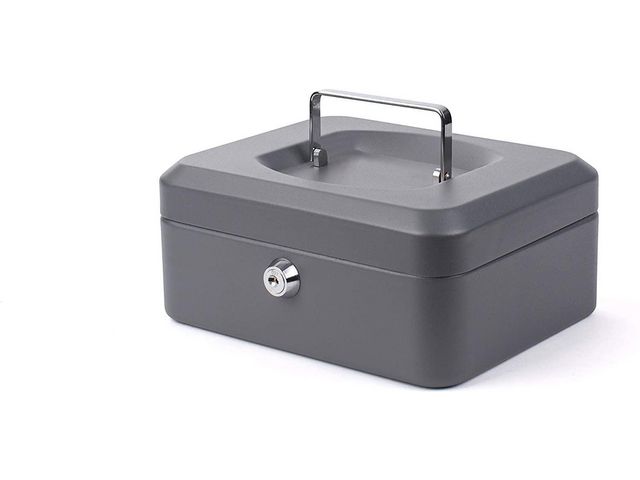 Säkert kassaskrin med 2 nycklar och myntlåda som är uttagbar.