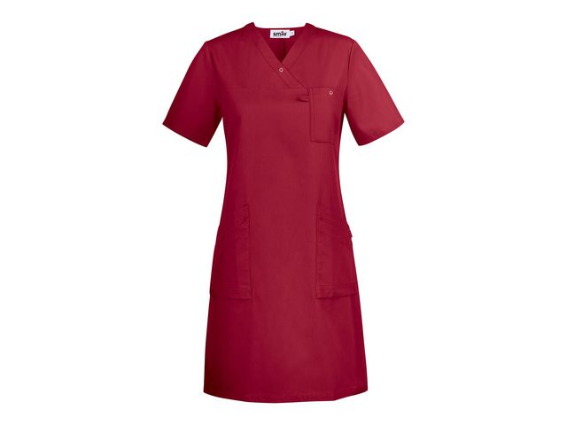 Modellen är utrustad med dubbla snedställda framfickor, varav en med integrerad nyckel- och korthållare för enkel förvaring. En praktisk bröstficka ger extra förvaringsmöjligheter, och en dekorativ ringknapp i V-ringningen tillför en elegant detalj. Med en rygglängd på 100 cm i storlek M erbjuder klänningen en bekväm passform som passar för både arbete och vardagsbruk.