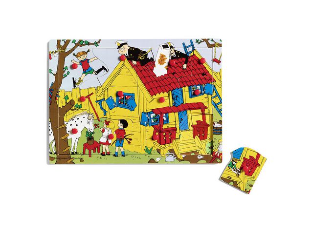 Pussla ihop Villa Villekulla! Bitarna i detta träpussel har små knoppar att hålla i. I pusslets ram finns bilden av huset och trädgården men utan Pippi och hennes kompisar, de finns på pusselbitarna! När du lägger pusslet får Villa Villekulla och trädgården liv och rörelse av Pippi, Tommy, Annika och de andra. Detta finurliga träpussel blir en succé hos alla barn som gillar Pippi Långstrump. Illustration av Ingrid Vang Nyman.