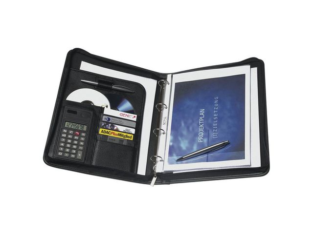 Konferensmapp med dragkedja i DIN A4-format med 4-ringspärm och löstagbar 8-siffrig miniräknare. Dessutom många praktiska fickor för dokument, visitkort etc.