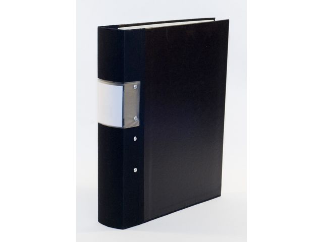 Gaffelpärm med svarta pärmsidor med kantförstärkning och raka hörn. Tygklädd trärygg och etiketthållare.