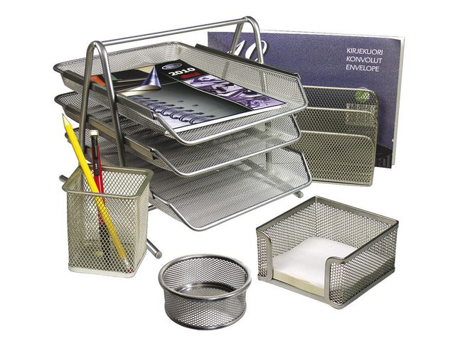 Det här skrivbordssetet kommer väl till pass på kontoret för enkel organisering av dagligt pappersarbete, brevpapper och andra viktiga tillbehör. Lådorna, korgarna och hållarna är tillverkade av metalltråd som gör dem både starka och robusta. Setet innefattar en brevkorg med tre fack, en filhållare, en pennhållare, en stifthållare och en öppen förvaringshållare på framsidan.