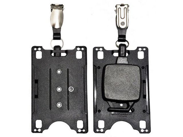 Korthållare med monterad yoyo på baksida. Monterad hängsleklämma. Speciellt lämplig för beröringsfria passerkort. Färg: Svart