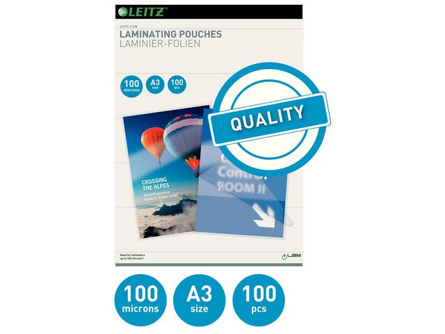 Lamineringsficka Leitz A3 100 micron. Laminat från leitz ger perfekt försegling för garanterat skydd mot smuts, vätska och fukt. Dessa lamineringsfickor är utmärkta för daglig laminering. Lamineringsfickorna har en blank yta för förbättrad färgåtergivning. De rundade kanterna ger en effektiv tätning och slutresultatet blir en ren och snygg finish. Laminat som passar perfekt med alla lamineringsmaskiner.