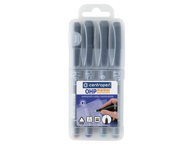 Dessa centropen 2636 OHP-märkpennor har en tunn spets som möjliggör exakt skrift. Det ergonomiska greppet minskar obehaget när du skriver under en lång tid. Det alkoholbaserade, permanenta bläcket är vattenfast och slittåligt. Du kan enkelt skriva, klottra eller rita på OH-film, glas, plast och textil(tvättäkta) med dessa märkpennor.