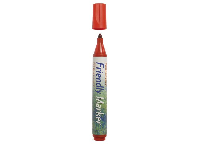 Märkpenna FRIENDLY rund röd. Alkoholbaserad permanent märkpenna. Fäster på de flesta underlag. Pennkroppen är tillverkad av återvunnet papper vilket minskar miljöpåverkan med 50 %. Rund spets, röd.