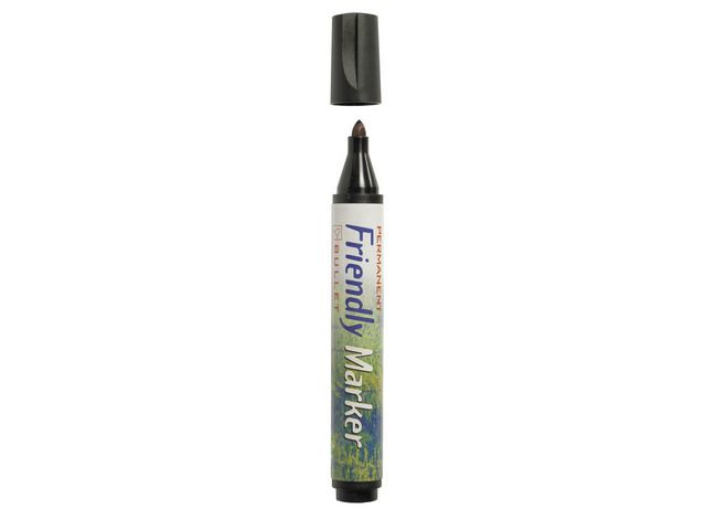 Friendly Alkoholbaserad permanent märkpenna. Fäster på de flesta underlag. Pennkroppen är tillverkad av återvunnet papper vilket minskar miljöpåverkan med 50 %. Märkpennan har rund spets.