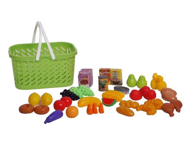 Plastvarukorg med 40 bitar lekmat i plast och kartong. I korgen hittar du allt från frukt, grönsaker, kött, frukost, konserver och kakor.