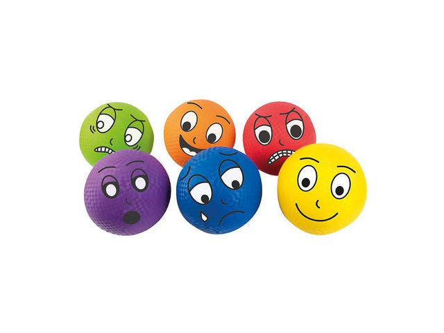 Ett PVC-fritt bollset med olika ansiktsuttryck som kan användas både till rolig bollek och för diskussioner kring känslor.