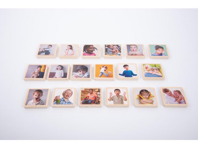 Perfekt för att prata med barn om hur de känner sig, lära dem att känna igen andras känslor och hjälpa dem att utveckla språket för att förklara sina känslor. Plattorna visar olika barn som visar ett utbud av 18 uttryck och reaktioner, från glada och uppspelata till rädda och arga. Känslorna som visas kan identifieras som en specifik känsla eller som en utgångspunkt för en konversation om de olika möjliga känslor eller känslor som upplevs. T.ex. barnet som håller en nalle och blir tröstad ser ledsen ut, vilket kan bero på att han känner sig ensam eller blyg. De tjocka plattorna är 12 mm tjocka, vilket gör dem till en perfekt storlek för yngre barn att plocka upp och hålla i, och kan läggas platta eller stå upprätt. Inkluderar bomullsdragsäck för förvaring.