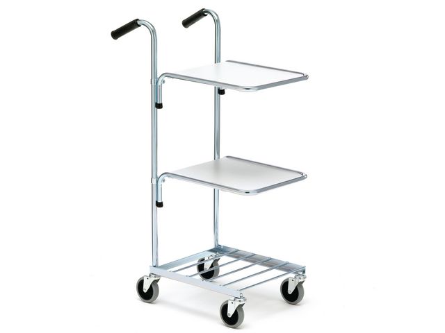 Hyllorna är steglöst ställbara i höjdled. Chassi i blankförzinkade 22 mm rör med rundade hörn. Gummerade körhandtag för ett bra grepp. Hyllskivorna är 12 mm tjocka och slitstarka och laminerade i ljusgrå färg.