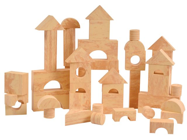 Ett set med mjuka träliknande klossar i olika former, vilket ger utrymme för kreativitet och fantasifullt byggande.