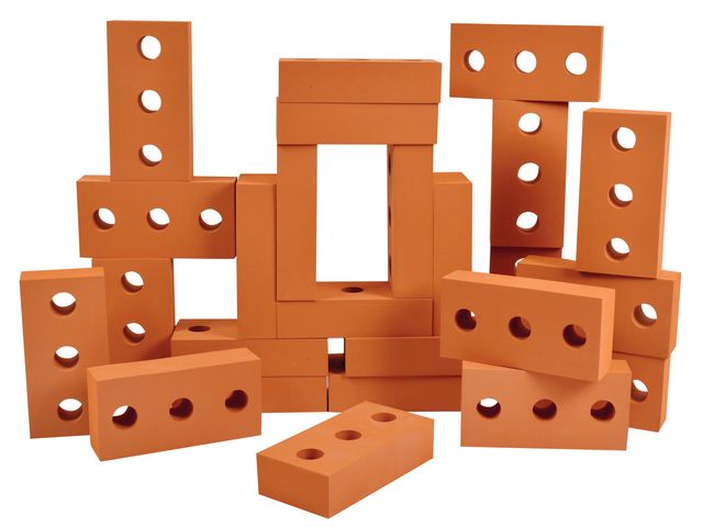 Klossarna efterliknar verkliga byggstenar i både storlek och färg och är utrustade med autentiska hål för att underlätta smidig hantering. Perfekta för lek inomhus och utomhus.