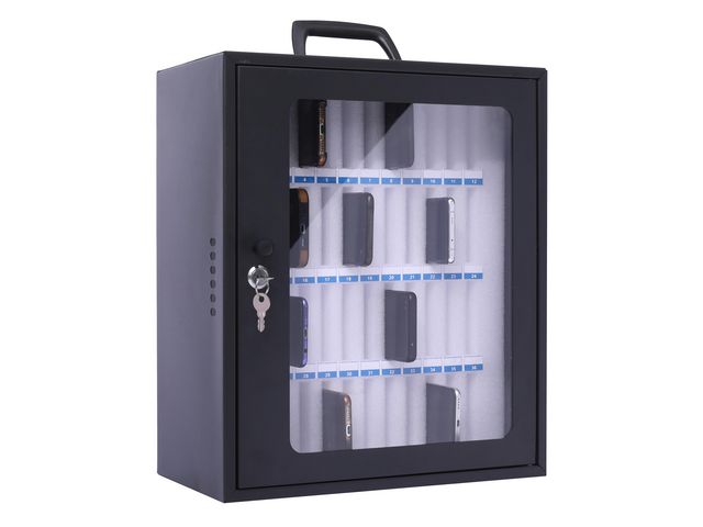 Detta förvaringsskåp av stål med en akryldörr är designat för att förvara upp till 48 smartphones på ett organiserat och repfritt sätt. Varje enhet får sin egen plats i mjuka skumfack som ger optimalt skydd och är individuellt numrerade, vilket gör att användarna snabbt och enkelt kan hitta sina telefoner. Skåpet är säkrat med ett nyckellås, vilket säkerställer säker förvaring under klasser eller träningspass. Den kan antingen fungera som ett bärbart alternativ eftersom den är utrustad med ett handtag eller vara väggmonterad för ökad säkerhet och utrymmesbesparingar. Skåpet är mycket lämpligt för att tillfälligt förvara smartphones på skolor, kliniker och andra områden där telefoner inte får tas med.
