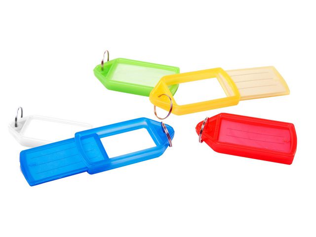Plastskylt med liten nyckelring. Med vita, utbytbara etiketter.