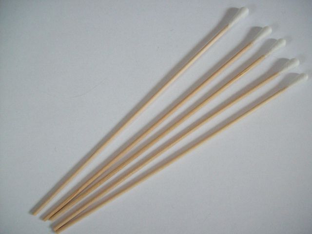 Öronpinne i trä med bomull i ena änden.