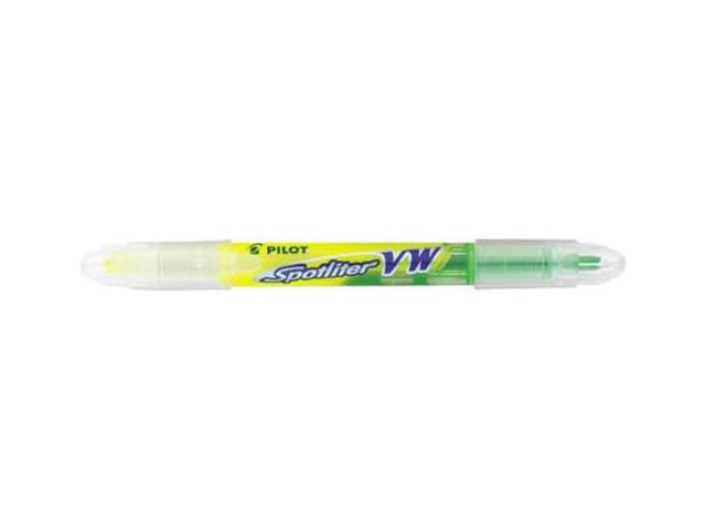 Pilots Spotliter VW är en dubbelspetsad överstrykningspenna med en regulator för att säkerställa det perfekta bläckflödet. Spotliter VW är en väldigt praktisk överstrykningspenna då den till 70% består av Gult bläck och till 30% av Grönt bläck, i samma pennkropp. Den tåliga spetsen är av hög kvalitet och bibehåller sin form. De intensiva färgerna ger dig den ultimata överstrykningspennan. Pennan är en del av Pilots BeGreen-sortiment som är producerat av återvunnen plast.